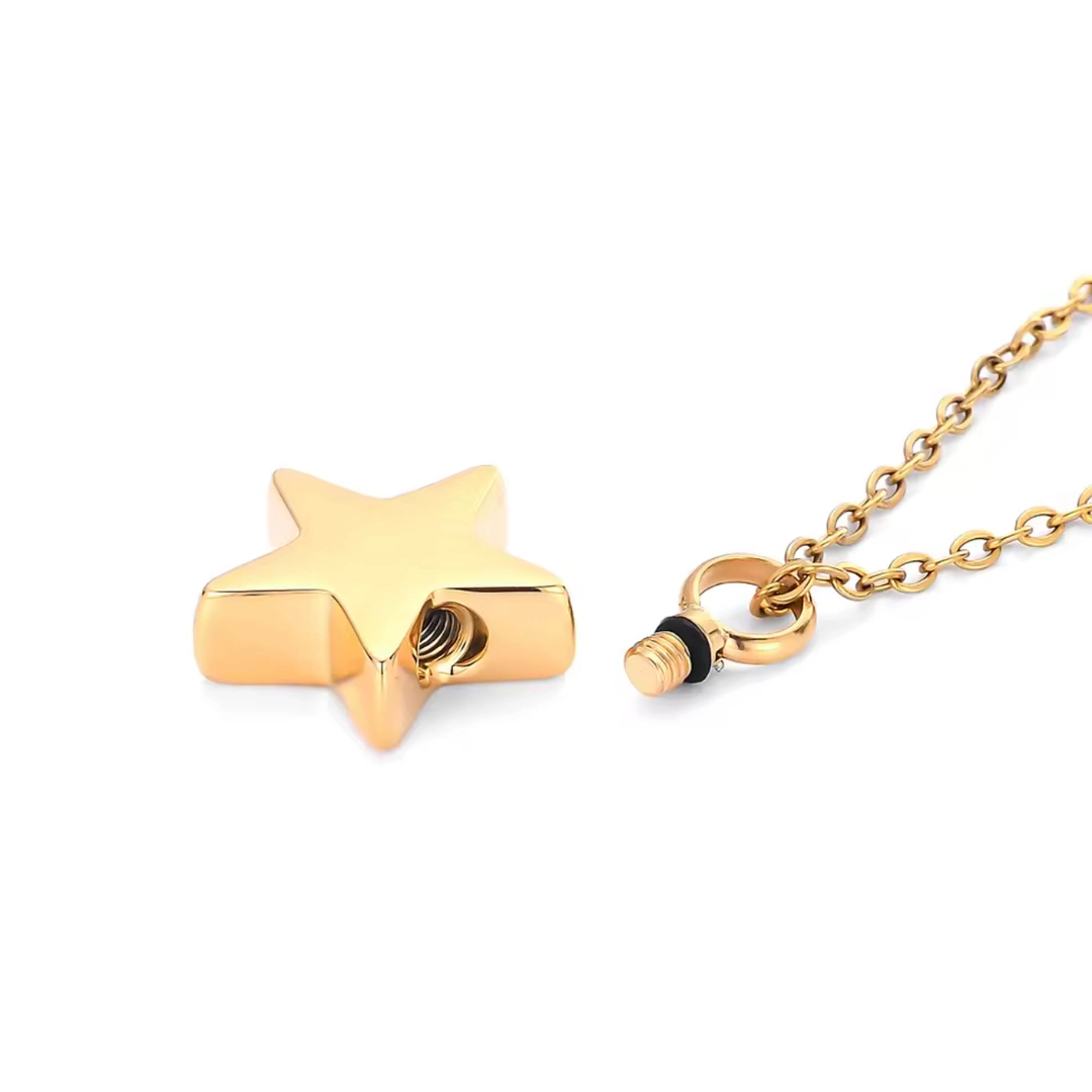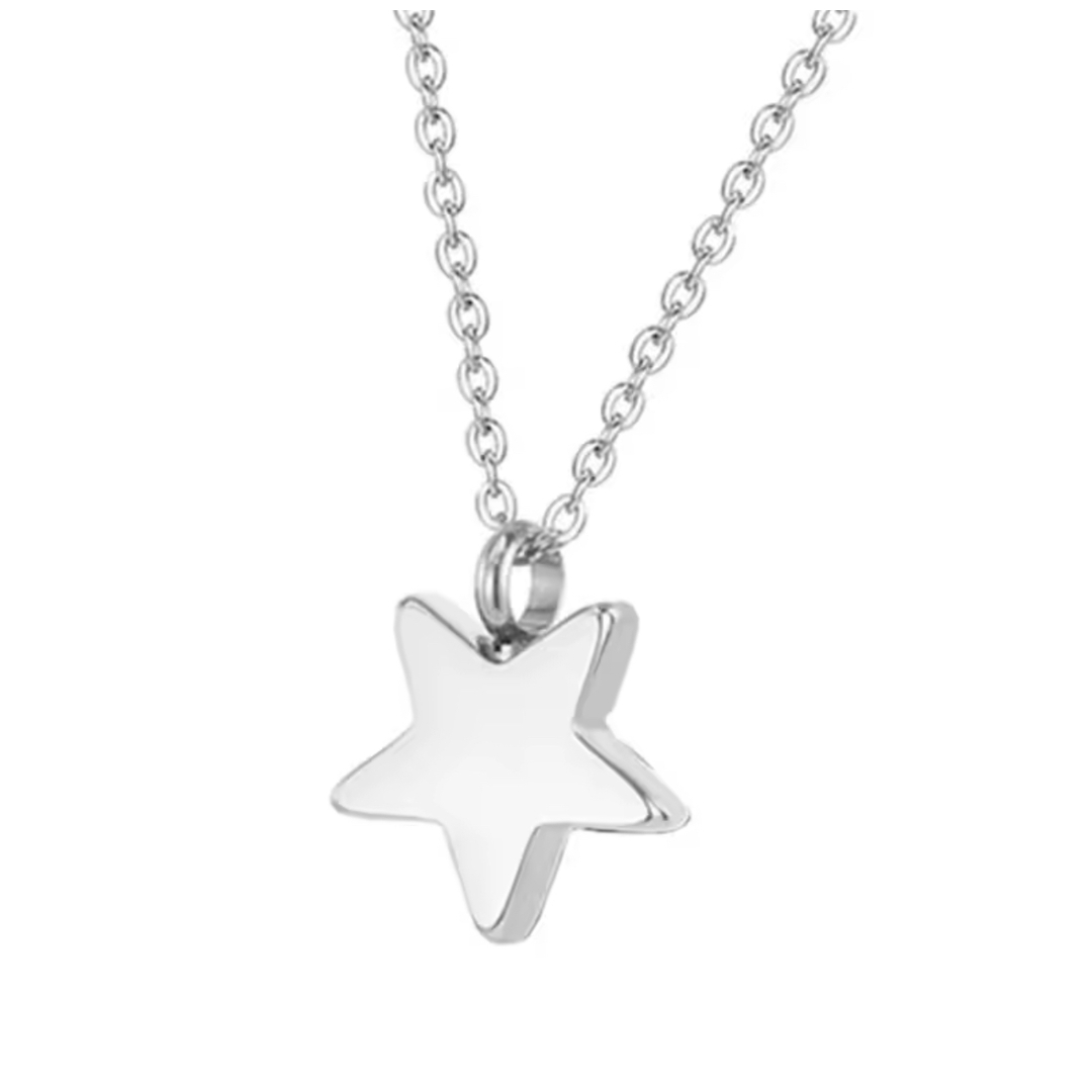 Deze gesloten stervormige ashanger in zilver heeft een verborgen ruimte om een symbolische hoeveelheid as te bewaren. Via het uitschroefbare lusje bovenaan voeg je eenvoudig de as toe. Daarna schroef je het veilig terug dicht. Door het oogje past een fijne ketting, die standaard wordt meegeleverd. Een ingetogen en betekenisvol juweel dat dicht bij het hart gedragen kan worden.