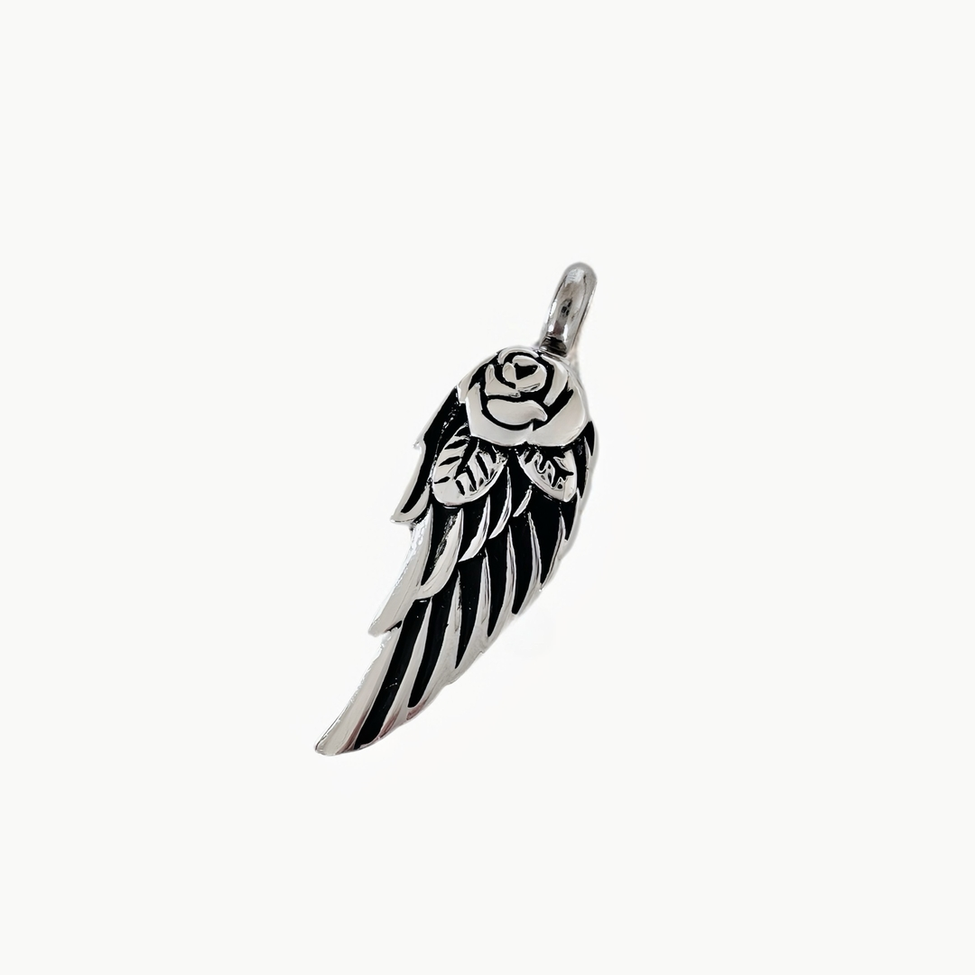 Deze hanger is een subtiel maar krachtig eerbetoon aan iemand die je mist. De combinatie van een beschermende vleugel en een roosje maakt dit ontwerp bijzonder geschikt als herinneringssieraad. Een ketting kan eenvoudig door het ringetje worden gehaald.
